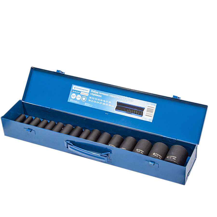 Размеры головок 1/2": 10 мм, 12 мм, 13 мм, 14 мм, 15 мм, 16 мм, 17 мм, 18 мм, 19 мм, 21 мм, 22 мм, 24 мм, 27 мм, 30 мм, 32 мм, 36 мм